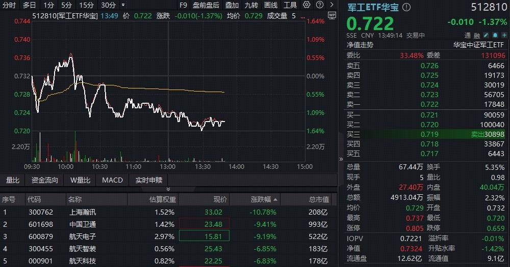 ETF方面卓信宝,高人气军工ETF华宝(512810)被动跟踪中证军工指数,午后一度跌至1.64%,止步四连阳,实时成交超4900万元。